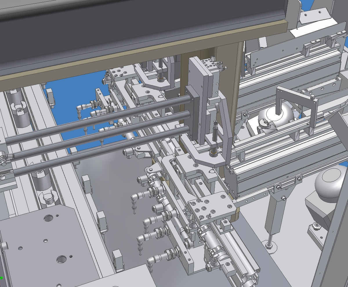 Tuotteiden automaattista käsittelyä tuotantosolun sisältä katsottuna. Tämä projekti on mallinnettu Inventor-ohjelmistolla.