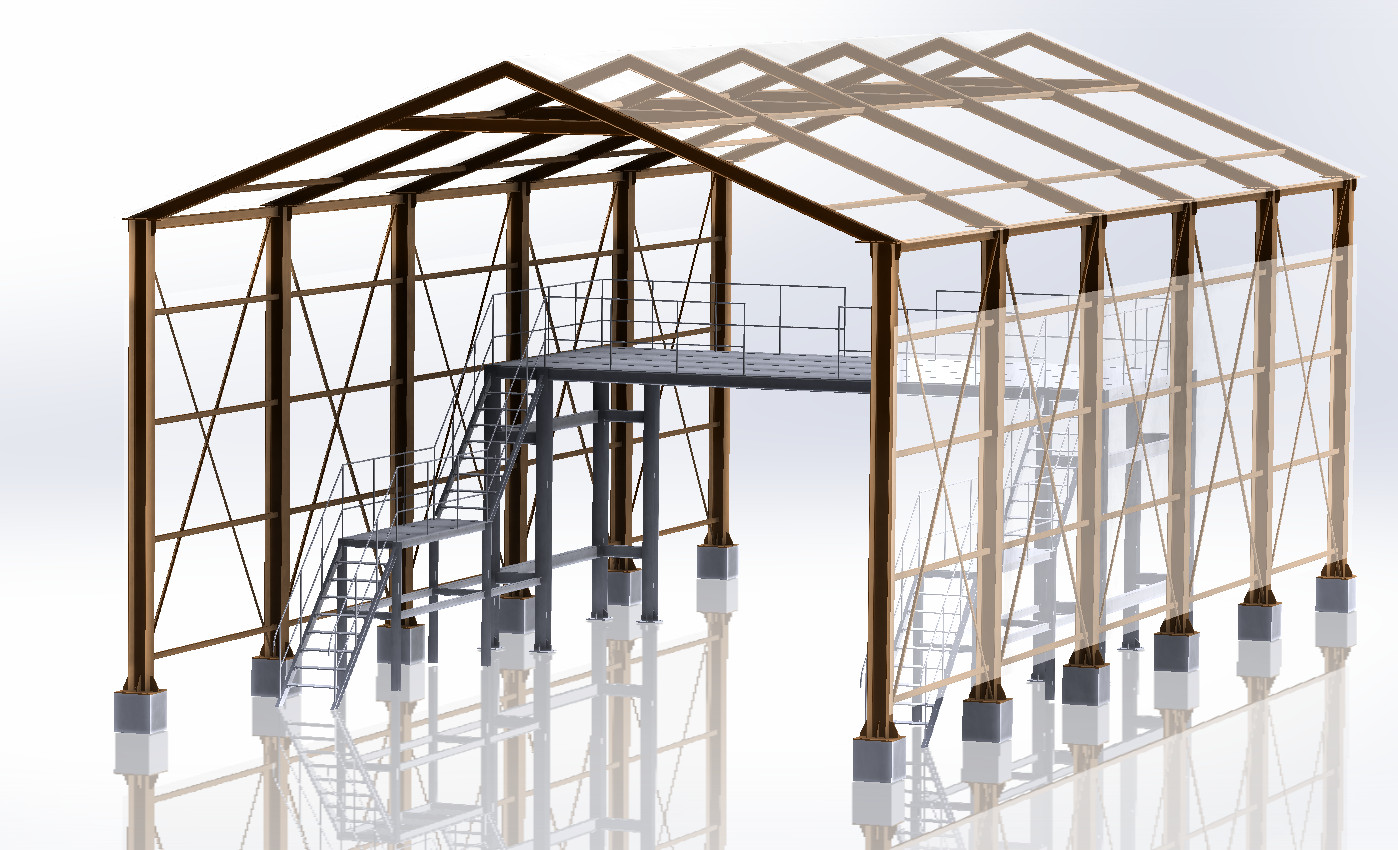 Teräsrakenteisen huoltotason ja suojan mallinnus SolidWorksilla.